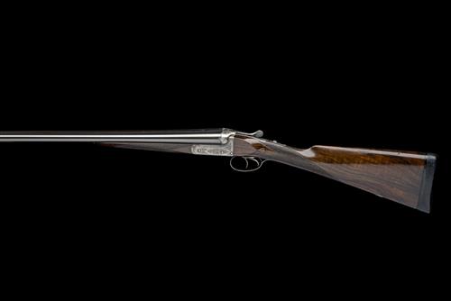 28in. nitro reproved barrels, the rib engraved 'WILLIAM EVANS. 63 PALL MALL. ST. JAMES'S. LONDON.', (refreshed), 2 3/4in. chambers, bored approx. 1/4 and 1/2 choke, some pits, treble-grip action with removable striker discs, slender toplever, automatic safety with gold-inlaid 'SAFE' detail, acanthus scroll engraving, retaining slight traces of original colour-hardening and finish, 14 1/4in. figured stock including 1in. leather covered recoil pad, weight 5lb. 3oz.