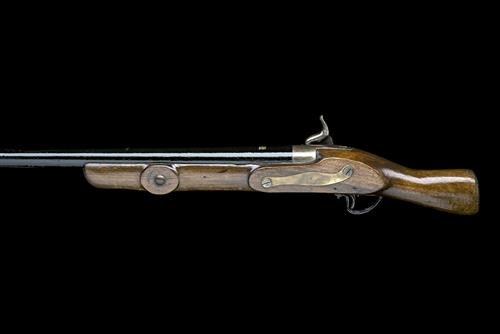 English, mid to late 19th century, with tapering round iron 54in. barrel later painted in black enamel, large military style borderline engraved lock possibly from a rampart gun signed 'POTTS, HAYDON ? MINORIES, LONDON' (rubbed, light pitting over lock), walnut half-stock with short butt, the fore-end bossed and drilled through for a pintle mount, sheet iron trigger-guard drilled through for a lanyard release