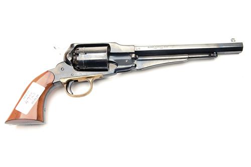 A BOXED REPRODUCTION .44 PERCUSSION REVOLVER SIGNED 'UBERTI', MODEL 'REMINGTON ARMY', serial no. 63500, with blued 8in. octagonal barrel, solid frame and plain cylinder, fitted with smooth walnut grips, in its makers card carton with flock-lined tray