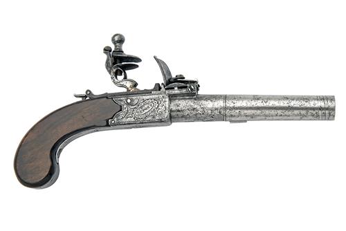 circa 1790, with round slightly tapering 2 3/4in. iron barrel, rounded breech with private proofs, engraved squared boxlock action signed in a banner on the left hand side 'COLLIS', and 'OXFORD' in an oval on the right, no provision for a conventional trigger to the floorplate, central hammer with sliding safe operating around the sides and also locking the frizzen down over the rainproof pan, thumb operated push-catch trigger mounted to the top-tang behind the safe and slab-sided walnut butt with oval escutcheon to rear
