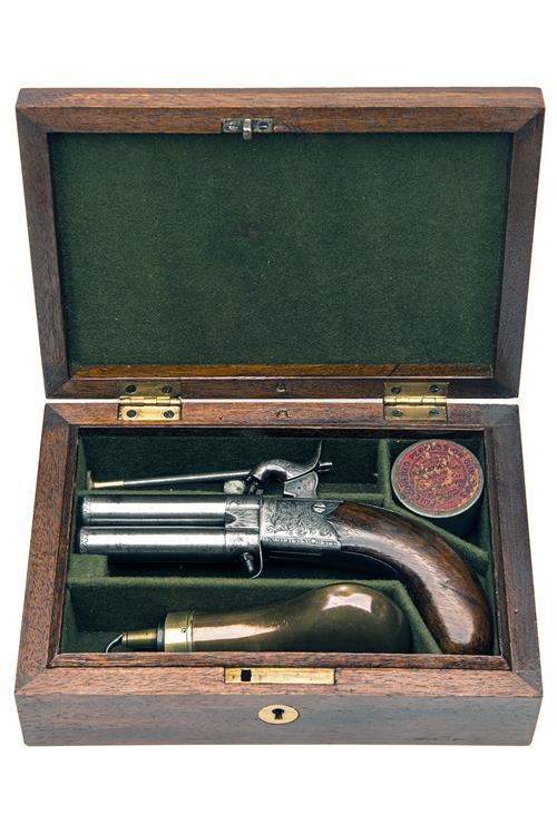 circa 1840, with turn-off Birmingham proved 2 3/8in. barrels, engraved bands and false rifling at muzzles, underslung nipple-guard, radiused border and scroll engraved action with central dolphin-headed hammer and concealed automatic trigger, signed top-tang and smooth walnut bag-shaped butt, in a later wood storage case compartmented and lined in olive baize and containing a period cap-tin, powder-flask and cleaning rod and associated barrel-key