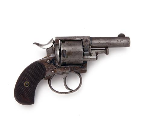 A .320 (SHORT-REVOLVER) SIX-SHOT POCKET-REVOLVER, UNSIGNED, MODEL 'THE ENGLISH BULLDOG', no visible serial number, Birmingham proofs circa 1890 and of Webley style, with ovoid 2 1/2in. barrel, plain cylinder, solid frame, guarded trigger and chequered walnut birdshead grips, finish worn, hammer spring weak