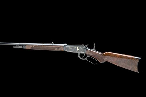 high-grade version produced in 1994, with blued half round, half octagonal 26in. barrel, the top-flat signed 'MANUFACTURED BY THE U.S. REPEATING ARMS CO., NEW HAVEN CT. USA', the left top flat marked 'WINCHESTER PROOF STEEL ESPECIALLY FOR SMOKELESS POWDER', dove-tailed blade fore-sight, buckhorn rear-sight, blued receiver with push-through safety and etched with scrolls around gilt bordered panels of mouflon and deer, each animal also gilded, folding peep-sight mounted to the top-tang, chequered highly-figured walnut pistolgrip butt-stock with crescent heel-plate, matching chequered walnut fore-end and half-length magazine, in its maker's card carton appearing unused