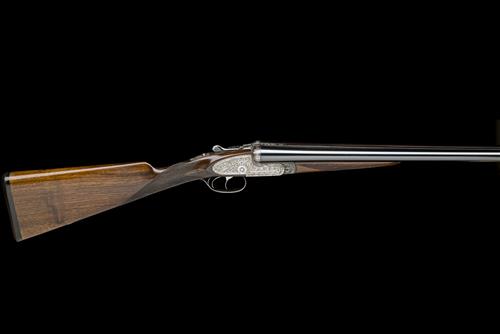 26in. nitro chopperlump barrels, 2 3/4in. chambers, bored approx. imp. cyl. and 1/2 choke, engraved arcaded fences, removable striker discs, automatic safety, hand-detachable lockplates, gold-inlaid cocking-indicators, articulated front trigger, rolled-edge triggerguard, acanthus scroll engraving, brushed bright finish retaining traces of colour-hardening, 15in. stock including 5/8in. rubber recoil pad, weight 6lb. 11oz., with a Croots canvas and leather slip