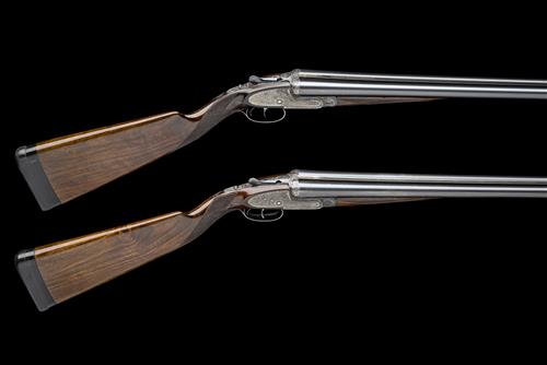 28in. nitro barrels, the ribs engraved with the makers details and gold-inlaid '1' and '2' at the breech ends, 2 3/4in. chambers, bored approx. imp. cyl and 1/4 choke (No.1), 1/4 and full choke (No.2), hand detachable lockplates, removable striker discs, automatic safeties with gold-inlaid 'S' details, gold-inlaid cocking indicators, articulated front triggers, rolled-edge triggerguards, border and acanthus scroll engraving, retaining much original colour-hardening and finish, 15 3/4in. crossover stocks (right shoulder left eye) including 1 1/4in. rubber recoil pads and extensions, weight 7lb. 8oz. (No.1) 7lb. 9oz. (No.2), in a tan leather double motorcase with canvas and leather outer