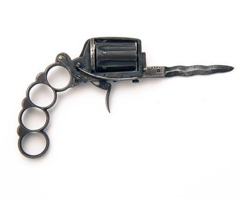 circa 1870, with fluted six-shot 'pepper-box' barrel group, solid iron frame with frontal cylinder release, extension piece to front lower frame signed 'L. DOLNE INV'UR', the left side mounted with a 3in. folding flambeau stiletto blade locking on a push-button catch, folding trigger and spurless hammer and folding curved iron grip comprising of four co-joined rings, slight traces of finish