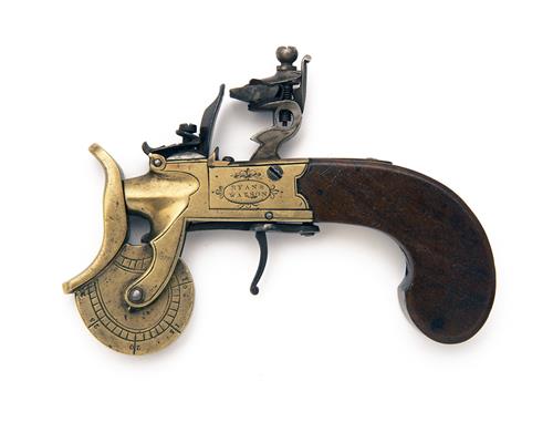 circa 1800, with brass squared boxlock action signed 'RYAN & WATSON, borderline and trophy engraving, central hammer and frizzen, the short 'barrel' operating on a graduated friction restrained scale underslung below the 'muzzle', slab-sided walnut butt and exposed iron trigger and tensioning spring