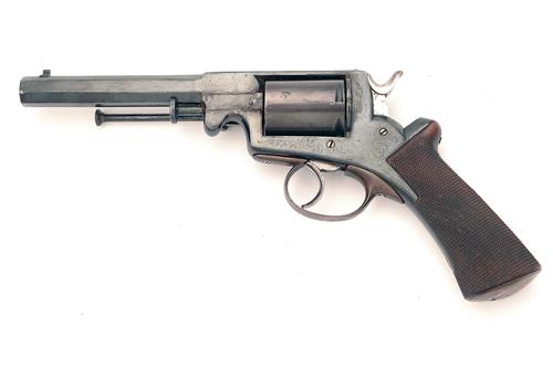 A .450 (BOXER) FIVE-SHOT REVOLVER, UNSIGNED, MODEL 'ADAMS PATENT', serial no. 4912, being a conversion from percussion of Adams revolver serial no. 20273, with octagonal 6in. barrel, blued frame with scroll engraving, plain blued cylinder and chequered one-piece grip, missing loading gate, re-finished with loss to detail, with a later leather holster