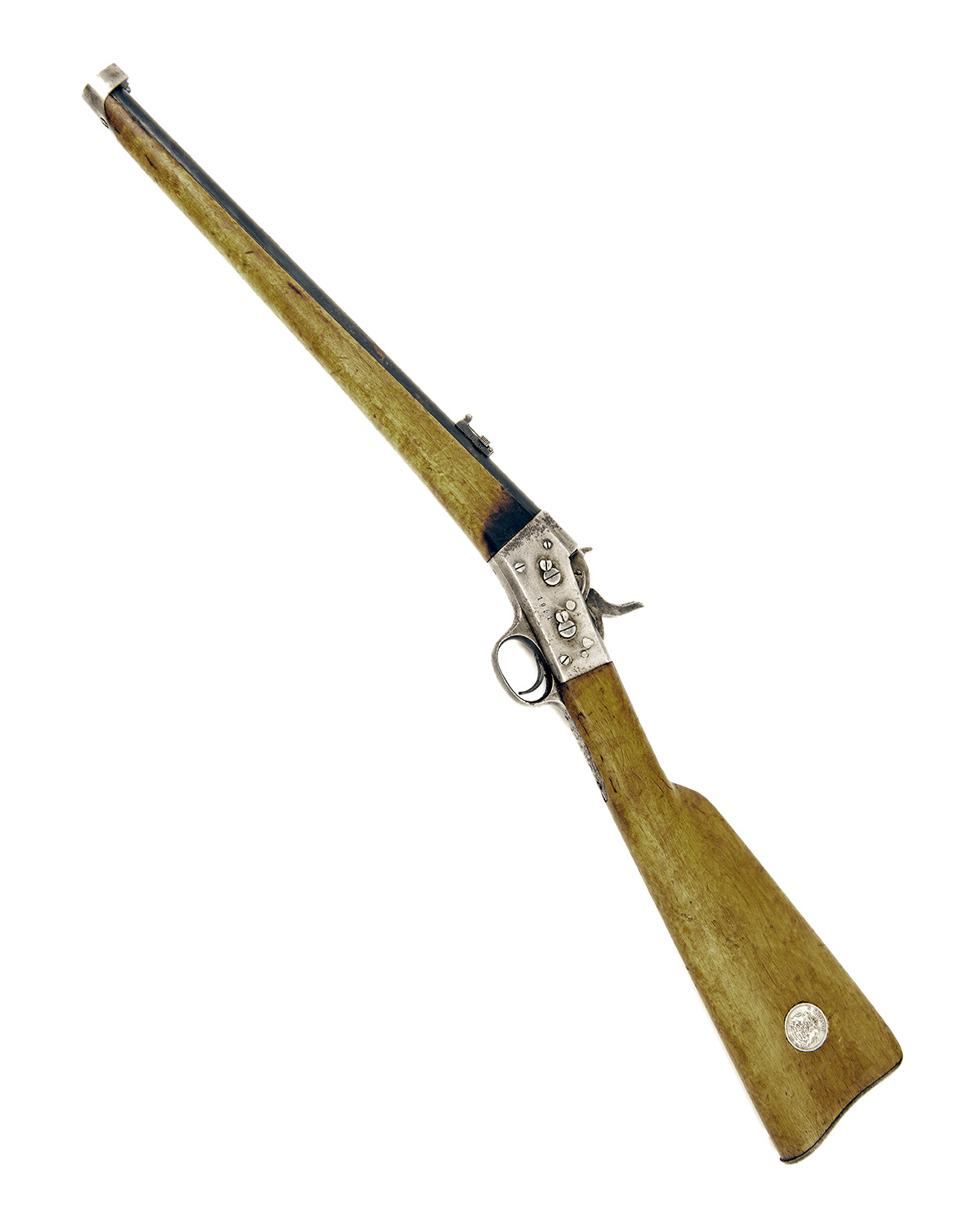 manufactured under licence from Remington by Husqvarna and dated for 1877, with blued 18in. barrel, iron nose-cap with integral fore-sight, small elevating ladder rear-sight, slab sided dated and numbered receiver with rolling breech and central hammer, pale walnut butt-stock (some hairline blind drying cracks forming), the left hand side inlet with an 1878 dated '2 Kroner' coin, iron heel-plate, no provision for saddle ring and full-length pale walnut fore-end, some staining throughout