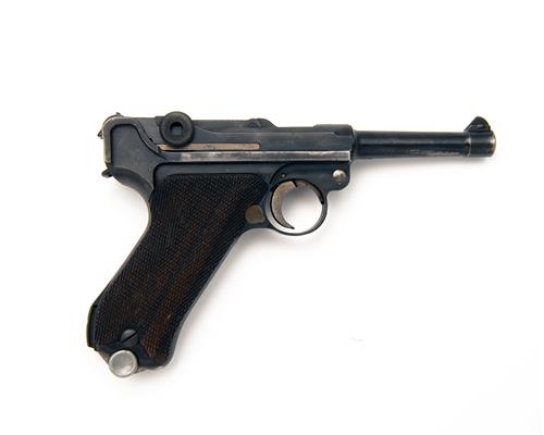 dated for 1939, with blued tapering 4in. barrel, blade fore-sight, standing notch rear-sight to the rear of the Mauser trademarked toggle, blued iron frame, chequered walnut grips, the back-strap cut for shoulder-stock and aluminium based military magazine, all matching numbers except magazine