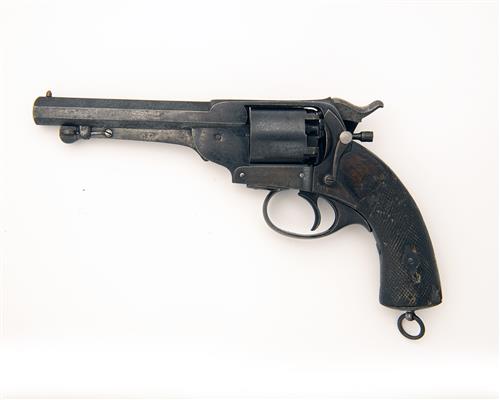 ORBEA, EIBAR 54-BORE PERCUSSION SINGLE-ACTION REVOLVER, MODEL 'SPANISH KERR COPY', serial no. 3782 circa 1860, with 5 5/8in. semi-octagonal barrel, bead fore-sight, plain top-strap stamped with the letter 'A.O.' with an anchor device between, repeated on the cylinder, lock and stamped in the wood, notch rear-sight to top of standing breech, plain five-shot cylinder (arbour release pin replaced), two-piece frame construction marked 'ORBEA HERM'S EIBAR' and with open sparse scroll engraving, coarsely chequered walnut grip with back-action lock inlet to the right hand side (chipped at lock tail), side hammer, lanyard ring at heel, single-action trigger (slightly at fault) and hinged under-barrel loading lever, strong traces of original finish