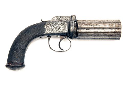 A 46-BORE PERCUSSION SIX-SHOT PEPPERBOX REVOLVER, no visible serial number,