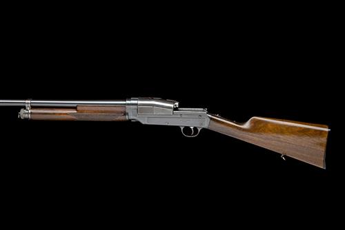 restricted magazine, 28in. nitro barrel, 2 1/2in. chamber, bored approx. 3/4 choke, Theodor Sjogren patent action, patent no. 26,868 of 1903, manual safety, retaining much blued finish, 14 1/4in. stock including buttplate, sling swivels, weight 7lb. 3oz.