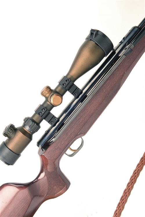 A SCARCE LEFT-HANDED .22 SIDE-LEVER AIR-RIFLE SIGNED AIR-ARMS, MODEL 'SE90', serial no. 42131, with blued 18in. barrel including attached sound-moderator, plastic load tap, blued air-chamber and beech three-quarter stock, fitted with a basketweave leather sling and a later 'HAWKE' 3-9x50IR telescopic sight, collector's condition