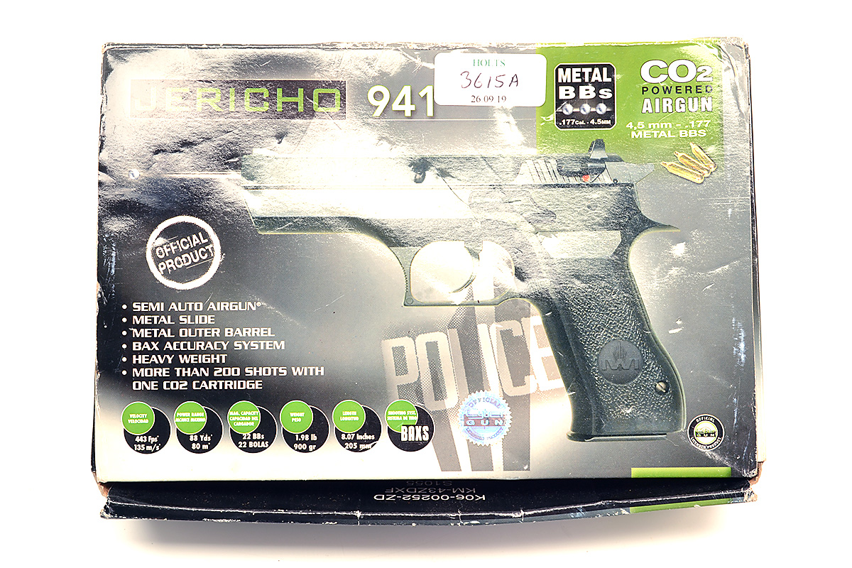 A BOXED .177 (BB) CO2-POWERED AIR-PISTOL SIGNED JERICHO, MODEL '941', serial no. 10809279, in imitation of the firearm of the same name, appearing little-used in its maker's card carton