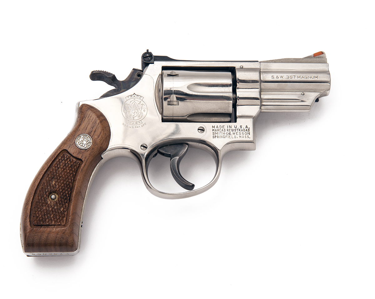 SMITH & WESSON .357 (MAG) SIX-SHOT REVOLVER, MODEL '19-3', serial no. K792059, with nickel-plated 2 3/8in. barrel, ramp fore-sight, adjustable rear-sight, plated solid frame and swing-out fluted cylinder, colour-hardened trigger and hammer, factory chequered wood grips, in its makers universal case