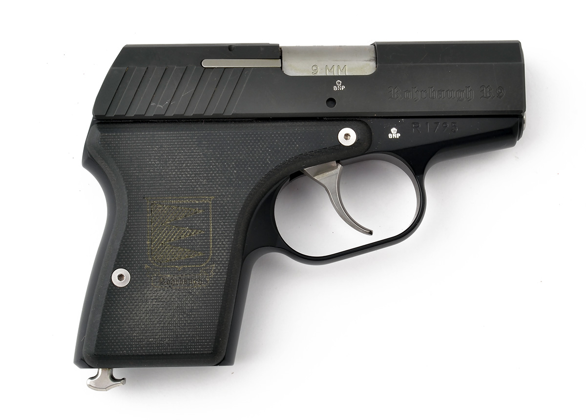 A CASED 9mm (PARA) SEMI-AUTOMATIC POCKET-PISTOL SIGNED ROHRBAUGH, MODEL 'R9', serial no. R1795, with 2 3/4in. barrel, sightless slide, flush fitting exposed hammer, blacked frame, double action only mechanism and composite grips laser etched with the company trademark, in its makers black abs plastic case with instructions and security lock, missing magazine