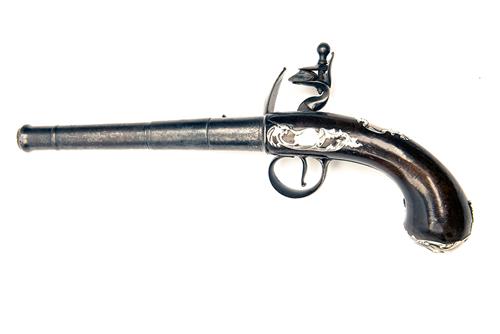 AN 18-BORE FLINTLOCK WHITE-METAL MOUNTED 'QUEEN-ANNE' PISTOL, no visible serial number,