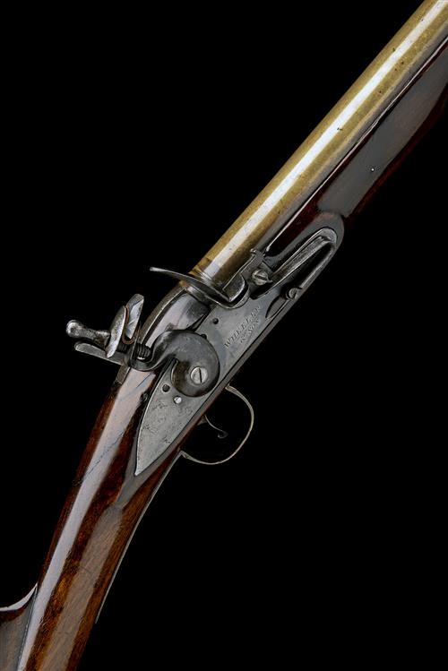 circa 1780, with banded cannon-muzzled 15 1/2in. barrel, the top of breech struck with London proofs and an 'R.W' below star maker's mark, plain iron top-tang, slightly radiused iron lock signed 'WHEELER & SON' below the pan (refreshed), pointed tail, walnut hand-rail full-stock (old cracks and repairs), plain serpentine brass sideplate, broad brass short-spurred brass heel-plate, brass lower tang and bow with ball finial, possible period horn-tipped ramrod