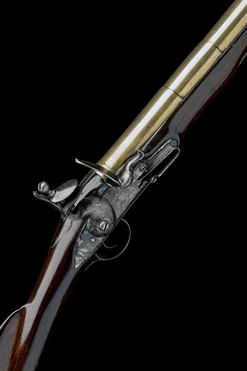 circa 1780, with triple-staged cannon-muzzled 16 1/4in. barrel, the top of breech deeply struck with London proofs and an 'I.B' below crown maker's mark, plain iron top-tang, radiused iron lock signed 'BINGHAM' in script below the pan (refreshed), borderline engraving and pointed tail, walnut hand-rail full-stock with carved apron around the top-tang, plain pierced brass sideplate, broad brass spurred brass heel-plate, brass lower tang (repaired) and bow, replacement iron ramrod