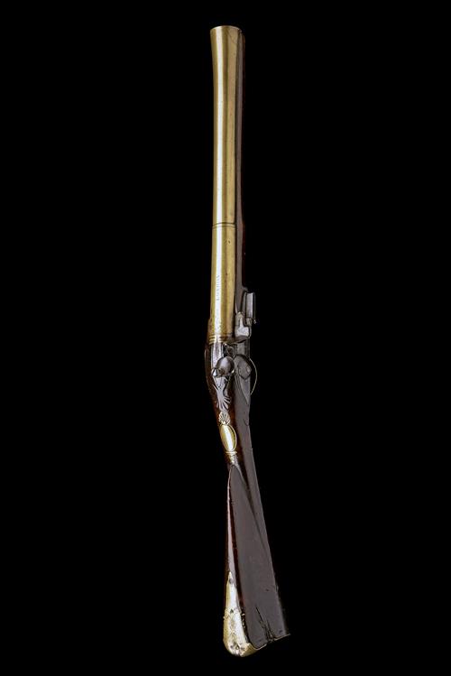 of coaching form circa 1770, with two-staged flaring 16 1/4in. barrel, moulded bands at the intersection and breech, the top of breech signed 'LONDON' forwards of a panel of scroll engraving, deeply struck London proofs and 'E.N.' oval maker's mark, shallow narrow sighting groove to top-tang, radiused iron lock signed 'E. NORTH' below the pan, borderline engraving and pointed tail, walnut hand-rail full-stock with shell carving around the top-tang, carved tear-drops behind the lock and pierced trophy brass sideplate, bordered oval brass escutcheon to wrist with classical mounts, broad brass long-spurred engraved brass heel-plate (heavy damage to edges in antiquity, see notes below), brass lower tang and bow, brass mounted wood ramrod
