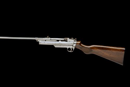 circa 1935, with brushed bright 25 1/2in. detachable barrel (numbered 12753), ramp and dove-tailed blade fore-sight, elevating notch rear-sight, rotating bolt-action locking catch, peep-sight at wrist, brushed bright air-chamber with patent markings and model details, trigger unit with maker's details, chequered walnut saw-handled butt-stock, horn heel-plate and no provision for fore-end, all metalwork stripped of original finish