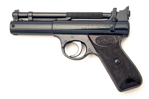 post war, with blued 6 3/4in. barrel, stirrup locking catch, adjustable rear-sight blade, blued stepped air-chamber with make and model details highlighted in white paint, three pin trigger group, chequered brown bakelite grips, virtually all its original finish remaining throughout and complete with its maker's card carton with green label and black paper covering (small losses), cleaning brush, pellet sample envelope and instruction label (tray worn)