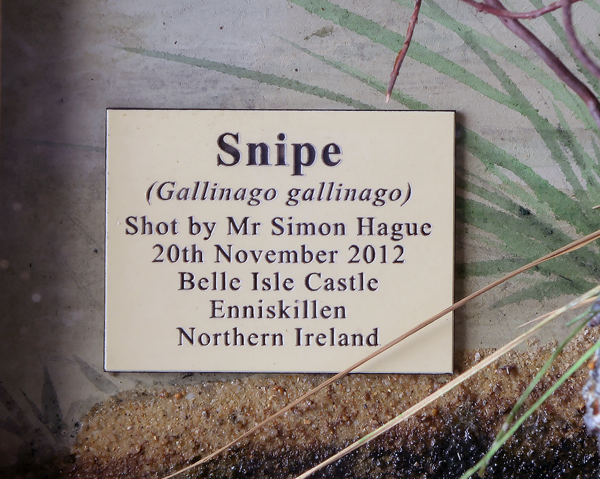 set in a five-sided glazed case with loch side setting, wooden wall mount frame, a plaque with 'SNIPE (Gallinago gallinago) Shot by Mr Simon Hague 20th November 2012 Belle Isle Castle Enniskillen Northern Ireland', measuring approx. 23in. x 18in. x 7in.