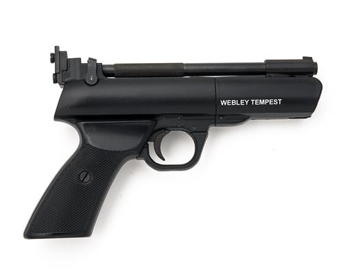 of 2000 produced in 2010 to celebrate the 100th anniversary of Webley's first airgun patent of 1910, with 6 7/8in. sighted barrel, stirrup barrel locking latch, adjustable rear-sight, black enamelled receiver with plastic furniture, side mounted safety, chequered black plastic grips, the heel bearing the special serial number and complete with its faux leather storage case lined and compartmented in dark blue baize, the inside of lid embroidered with the Webley 'winged bullet' trademark above '1910-2010, 100 YEARS OF QUALITY AND INNOVATION IN AIRGUNS', together with its instruction handbook and certificate of authenticity, an earlier circular tin of pellets (with contents, tin dented) and a wire handled cleaning brush, all apparently unused