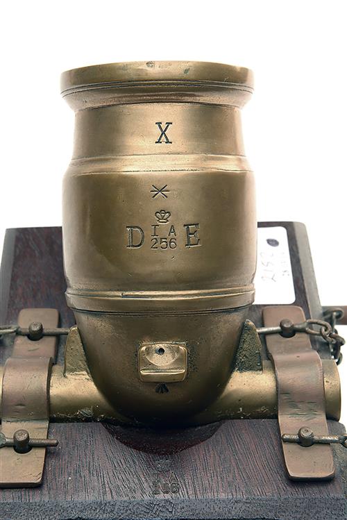 AN INERT SCALE MODEL OF A BRONZE MORTAR, made for desk display, the 5 1/2in. barrel marked 'D.E.' with crown over 'I'A' over '256' separating the letters, sold out of service arrows and the letter 'X', fitted onto a solid teak mount stamped with matching marks with brass plaque to front for engraving and brass furniture, the muzzle with brass cap bearing a Royal Army Ordnance Corps button