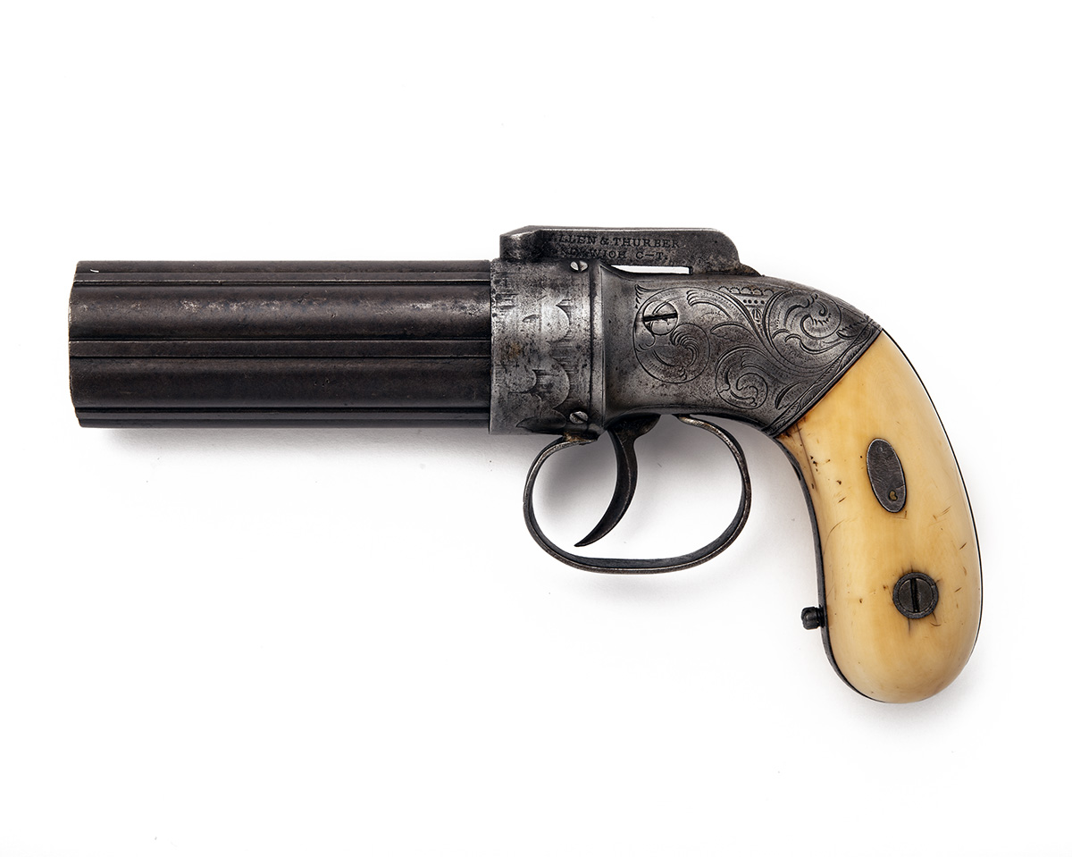 early type circa 1843, with 3in. six-shot barrel cluster, flat side-ribs, one stamped 'CAST STEEL' and 'PATENTED 1837', applied roll engraved nipple-shield, rounded loosely scroll engraved bar-hammer action, the side of the hammer marked 'ALLEN & THURBER NORWICH C-T', the top of hammer 'ALLEN'S PATENT' (the latter rubbed), guarded trigger, quick drop handle fitted with ivory grips, both in turn inlet with small oval escutcheons, slight traces of finish