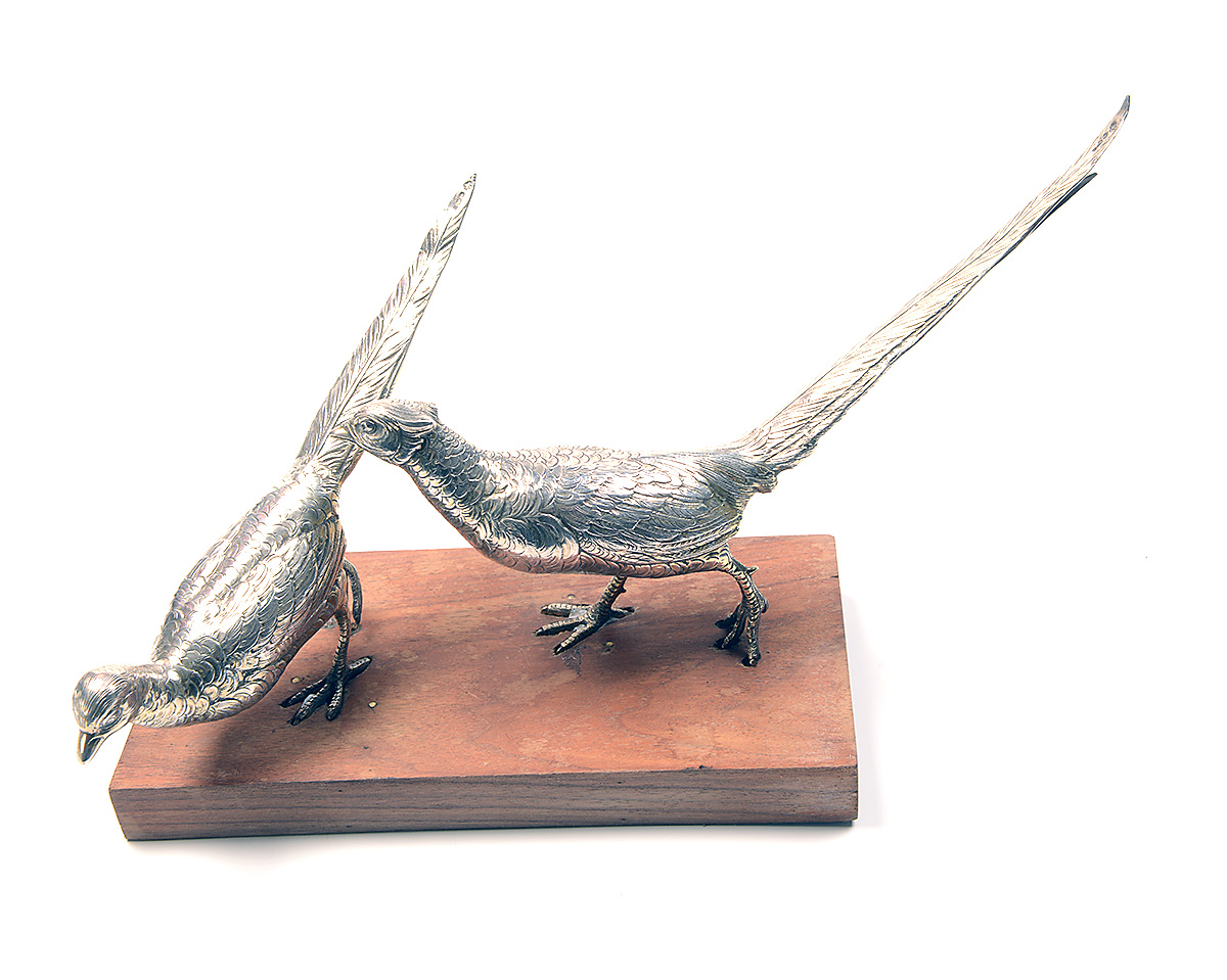 A BRACE OF CAST .925 SILVER PHEASANTS RETAILED BY ASPREY,