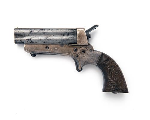 circa 1870, with 3in. barrel-group (mostly cleaned of finish), plain (silver?) plated brass frame signed 'TIPPING & LAWDEN SHARP'S PATENT' in a circle around the hammer axis screw on the left hand side, centrally mounted blued hammer with rotary auto-indexing nose, florally embossed gutta-perch grips and long bar push button opener, much plated finish remaining
