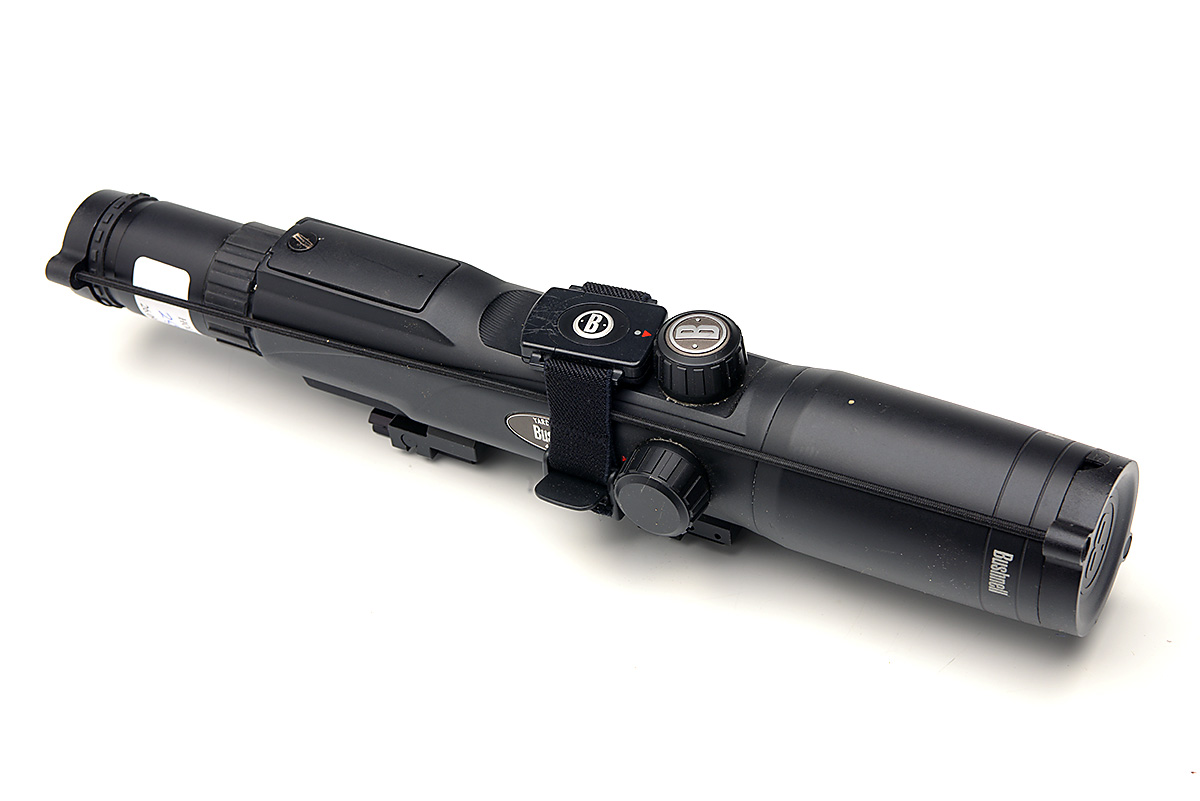 A BUSHNELL 'YARDAGE PRO 4-12X42' RANGE FINDER TELESCOPIC SIGHT, waterproof and fog-proof, with integrated range finder, lens protectors, dovetail scope rail