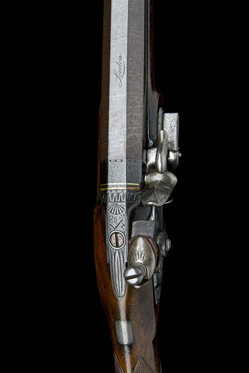 circa 1795, with triple-staged re-browned 30 1/2in. barrel, the top signed in script 'LONDON' (refreshed), bead fore-sight, engraved and yellow metal bands at breech, platinum lined touch-hole, engraved top-tang, border engraved bevel edged step-tailed lock signed 'TIPPING' below the pan (possibly renewed), engraved front frizzen-face and cock, walnut half-stock chequered at the wrist, iron furniture, plated nose-cap and brass tipped mahogany ramrod