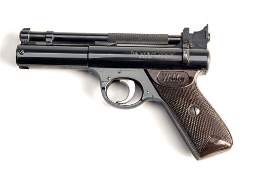 accompanied with a factory enquiry letter dated May 1946 stating this product will not be available until August/September of the same year, the pistol with sighted rifled 6 1/2in. barrel, blued stepped air-chamber marked 'WEBLEY PATENTS', model designation and the Birmingham '4' address, three pin trigger-group, chequered brown bakelite grips, the whole appearing little used with slight storage marks only and complete with its rare post-war black leatherette or 'Rexine' case, the interior compartmented and lined in green baize, the inside of lid with a printed black and gold trade-label stating 'WEBLEY & SCOTT LTD, ESTABLISHED 1790, PREMIER WORKS, BIRMINGHAM, GRAND PRIX DU CASINO A MONTE CARLO-FIVE YEARS', the case containing a good orange label Webley oil tin with horizontally stored spout (full), an orange 'WEAMAN STREET' rectangular pellet-tin for 'WEBLEY SPECIAL PELLETS' (empty), another of usual style (full) and a sheet of cocking instructions (oil soaked), the outer with double non-locking clasps (some tarnish to brightwork, wear to handle and a small old repair to rear top edge of lid) and also with its manufacturers brown card carton with applied blue label (excellent throughout) and containing a period tube of 'BSA' grease, a wire-handled cleaning brush, the original pistol swing ticket, leather breech washer and sample packet of pellets (empty) as well as the earlier mentioned correspondence and a period factory brochure