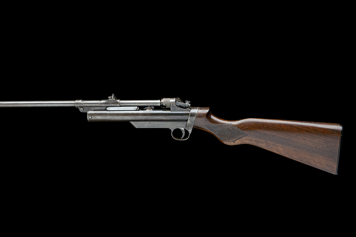 intermediate model with detachable 25 1/2in. barrel, ramp and blade fore-sight, elevating notch rear-sight and 'L' shaped peep-sight at wrist, push button barrel release to cradle, bolt-action barrel locking (cocking bars replaced), plain air-chamber with patents, safety catch to trigger unit, walnut semi-saw handled butt-stock, horn heel-plate and no provision for fore-end, traces of original finish with pin-prick pitting
