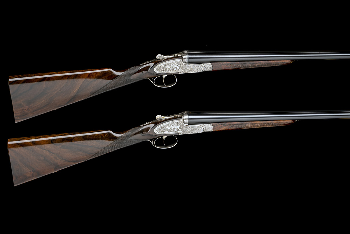 26in. nitro chopperlump barrels engraved with the makers details, the ribs gold-inlaid '1' and '2' at the breech ends, 2 3/4in. chambers, bored approx. imp. cyl. and 1/2 choke, toplevers gold-inlaid '1' and '2', removable striker discs, automatic safeties with engraved 'SAFE' details, Holland & Holland style self-opening systems, hand-detachable lockplates, articulated front triggers, rolled-edge triggerguards, fully engraved with bold acanthus scrollwork, the undersides with the makers details in elaborate cartouches, the triggerguards relief engraved and gold-inlaid with fleur-de-lys motifs and 'A.C.', bright finish overall, 15in. figured stocks, gold oval escutcheons engraved with an 'M' surmounted by a Baronial coronet, weight 6lb.