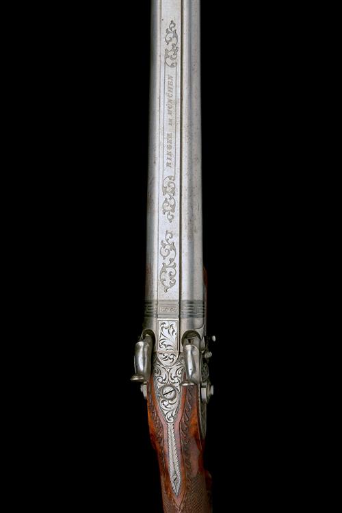 circa 1840, with brushed bright Liege proved 30 1/2in. barrels, the broad flat top-rib inlaid with white-metal scrolls for the first two fifths around a bordered panel signed 'RIEGER IN MUNCHEN', further inlaid bands and Greek key designs at breech, scroll engraved long top-tang, scroll engraved bar-action locks with swinging safes and carved and engraved hammers, figured walnut half-stock with complex bordered chequered panels to the fore-end and wrist, raised carved acanthus borders around the top-tang and a carved panel of acanthus foliage behind the raised moulded cheek-piece, smooth wood butt-end with iron heel-cap, carved walnut trigger-guard bow with white-metal screw escutcheons and horn-tipped wood ramrod