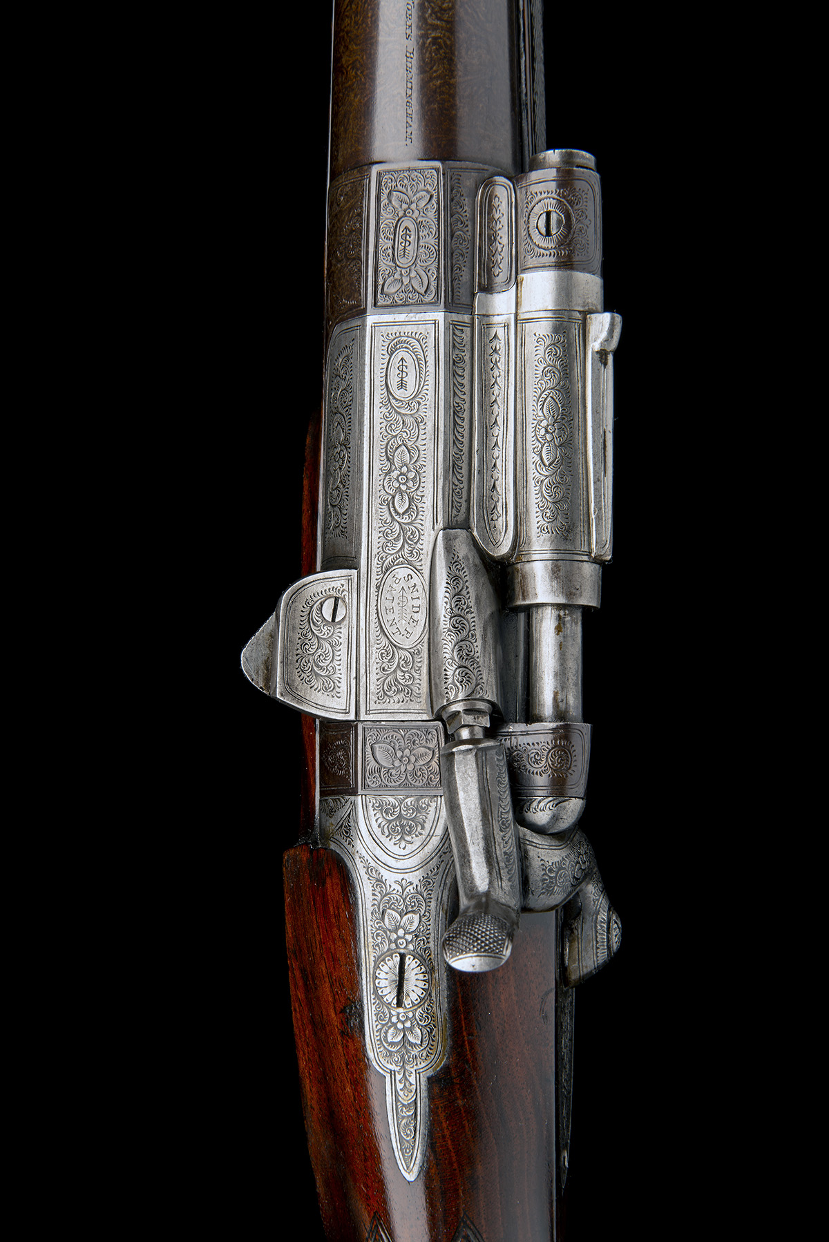 circa 1875, with tapering browned 32 3/4in. damascus barrel signed near breech 'ROBERT HUGHES, UNIVERSAL FIREARM WORKS BIRMINGHAM', engraved receiver bridge incorporating the Snider 'arrow' trademark, fully borderline and scroll engraved flip-open breech-block also incorporating the trademark and 'SNIDER'S PATENT', borderline and florally engraved top-tang and block hinge, border and florally engraved bar-action lock signed 'R. HUGHES', en-suite external hammer, chequered walnut half-stock, iron furniture including lower tang with raised chequered pistol-grip spur and moulded horn fore-end tip