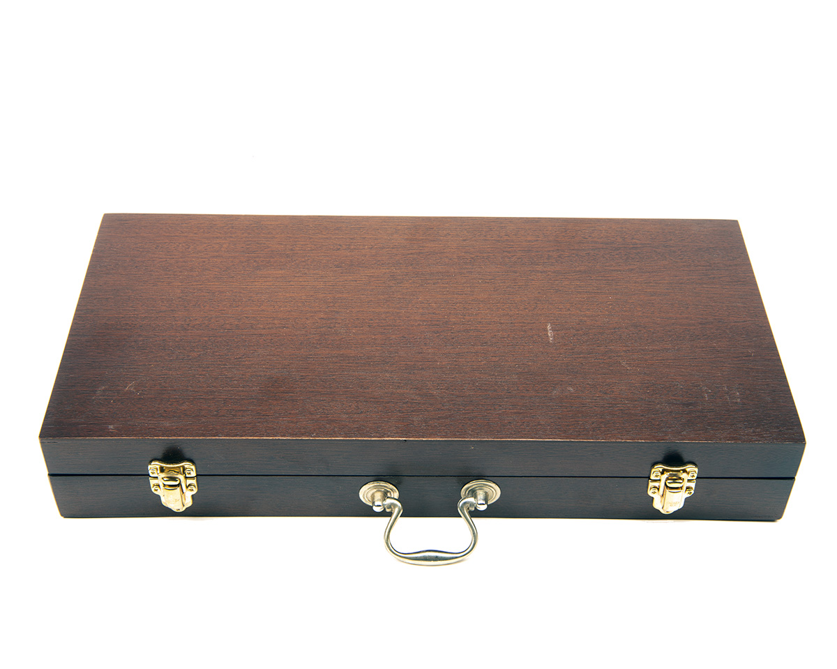 comprising of a two-piece cleaning rod, 12-bore snap-caps, oil bottle, choke gauge, mop, jag, brush, presented in a green baize-lined case