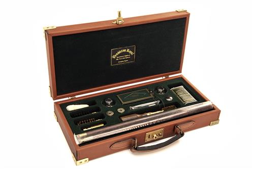 comprising of a three-piece cleaning rod, oil bottle, 12-bore snap-caps, mop, jag, brush, presented in a green baize-lined case