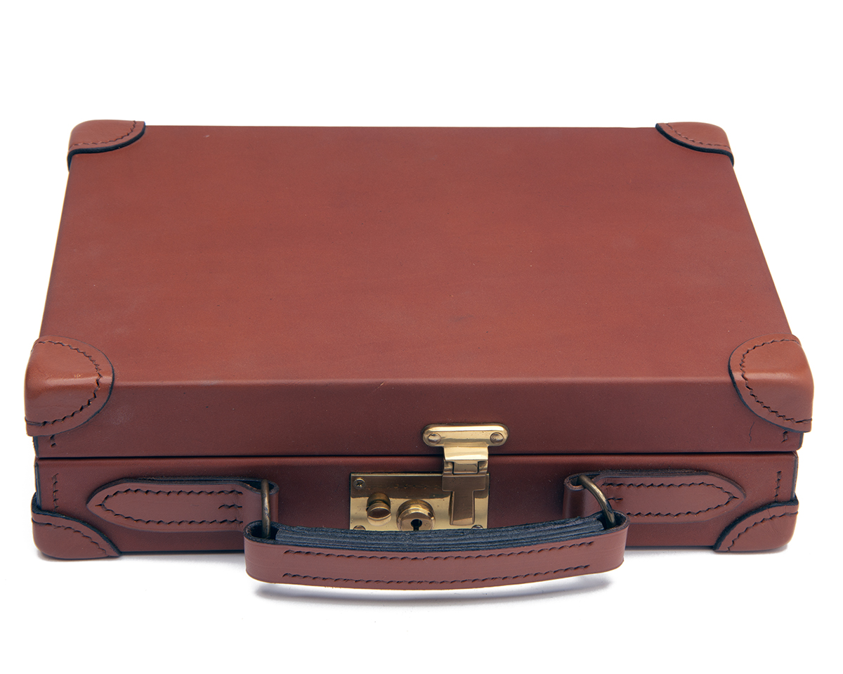 AN UNUSED LEATHER CASED PRESENTATION 12-BORE GUN CLEANING KIT,