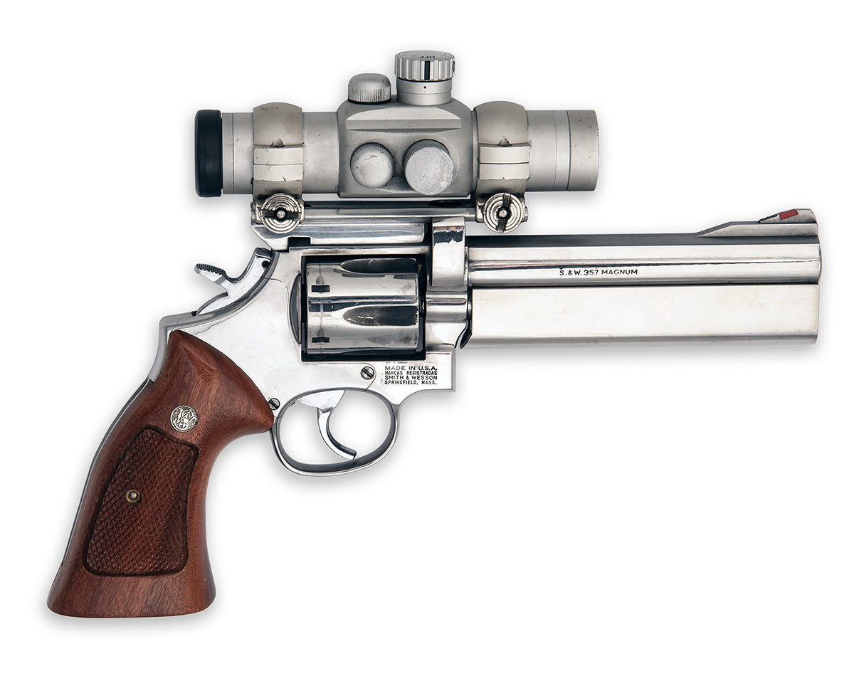 with mirror-polished stainless-steel 6in. barrel, red-ramp fore-sight, the rear-sight replaced with a Picatinny rail mount, full length polished stainless barrel weight, fluted swing-out cylinder, solid stainless frame, chequered wood factory grips and fitted with a Tasco Pro-Point red dot sight, complete with a cordura 'Pro TSC' gunbag
