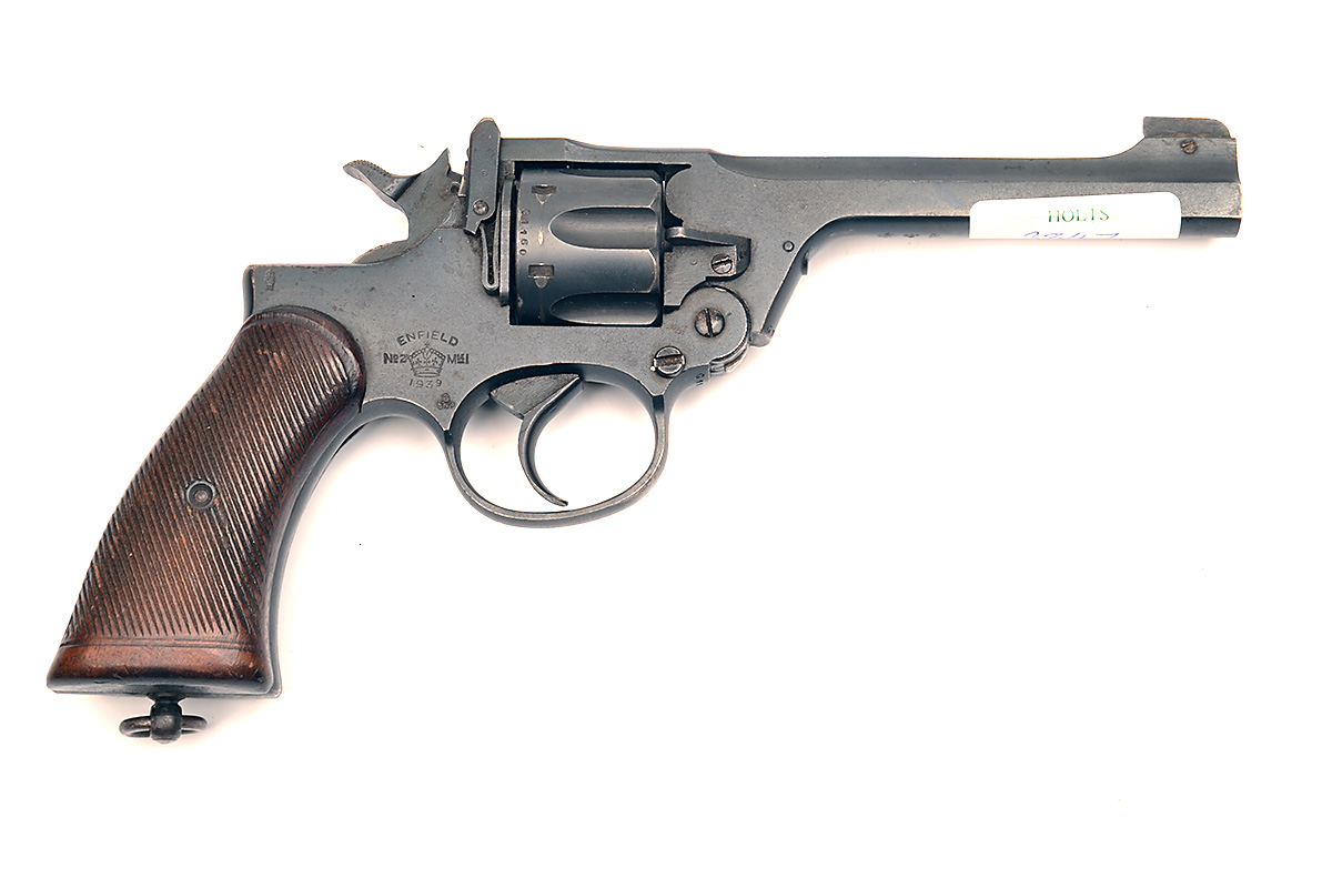 A .38 (200) SERVICE-REVOLVER SIGNED ENFIELD, MODEL 'No2MKI', serial no. G1160, dated for 1939, with 5in. barrel, break-open frame with auto-ejecting fluted cylinder, spurred hammer and grooved walnut grips with lanyard ring at heel, much finish