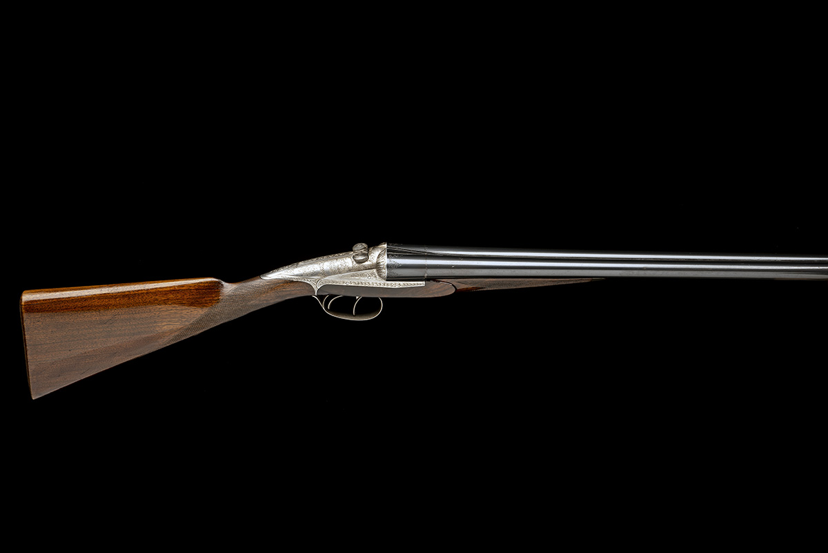 27 5/8in. (70cm) nitro monobloc barrels with sunken matt top rib and no under rib, scroll engraving at the breech end, 9 punch marks, 2 3/4in. chambers, bored approx. 1/4 and 3/4 choke, some internal pitting, sprung sliding-breech with converging obturator discs, button barrel release, manual side safety, bouquet and scroll engraving with carved leaf fences, bright finish overall, 14 3/8in. semi-pistolgrip stock (wear to finish), sling swivel aperture, fore-part with horn finial, weight 5lb. 14oz.