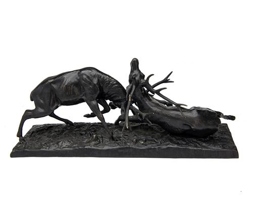 A BRONZE SCULPTURE OF TWO RUTTING RED STAGS,