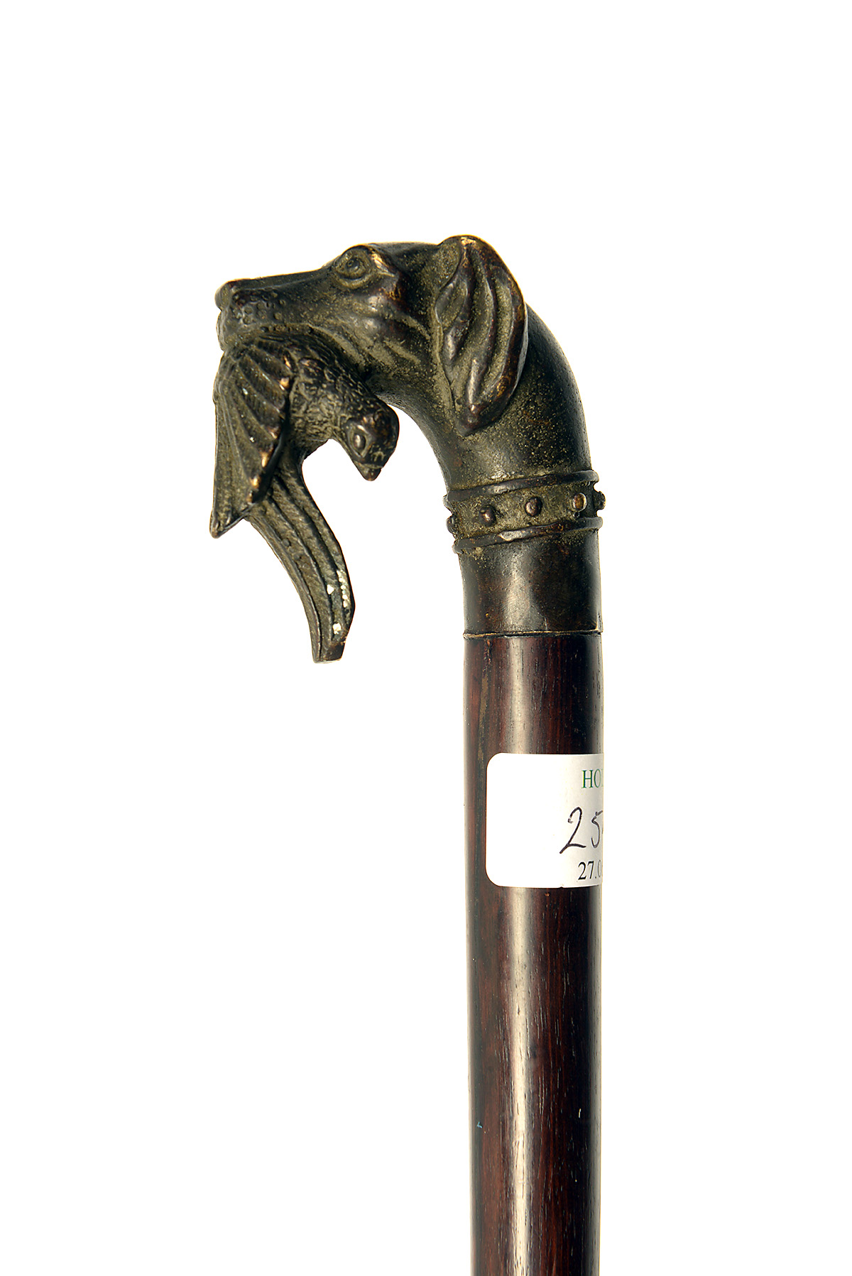 A MODERN WALKING STICK WITH CAST BRONZE DOGS HEAD POMMEL, 34in. overall, the pommel formed as a realistic retrievers head holding a dead gamebird in its mouth