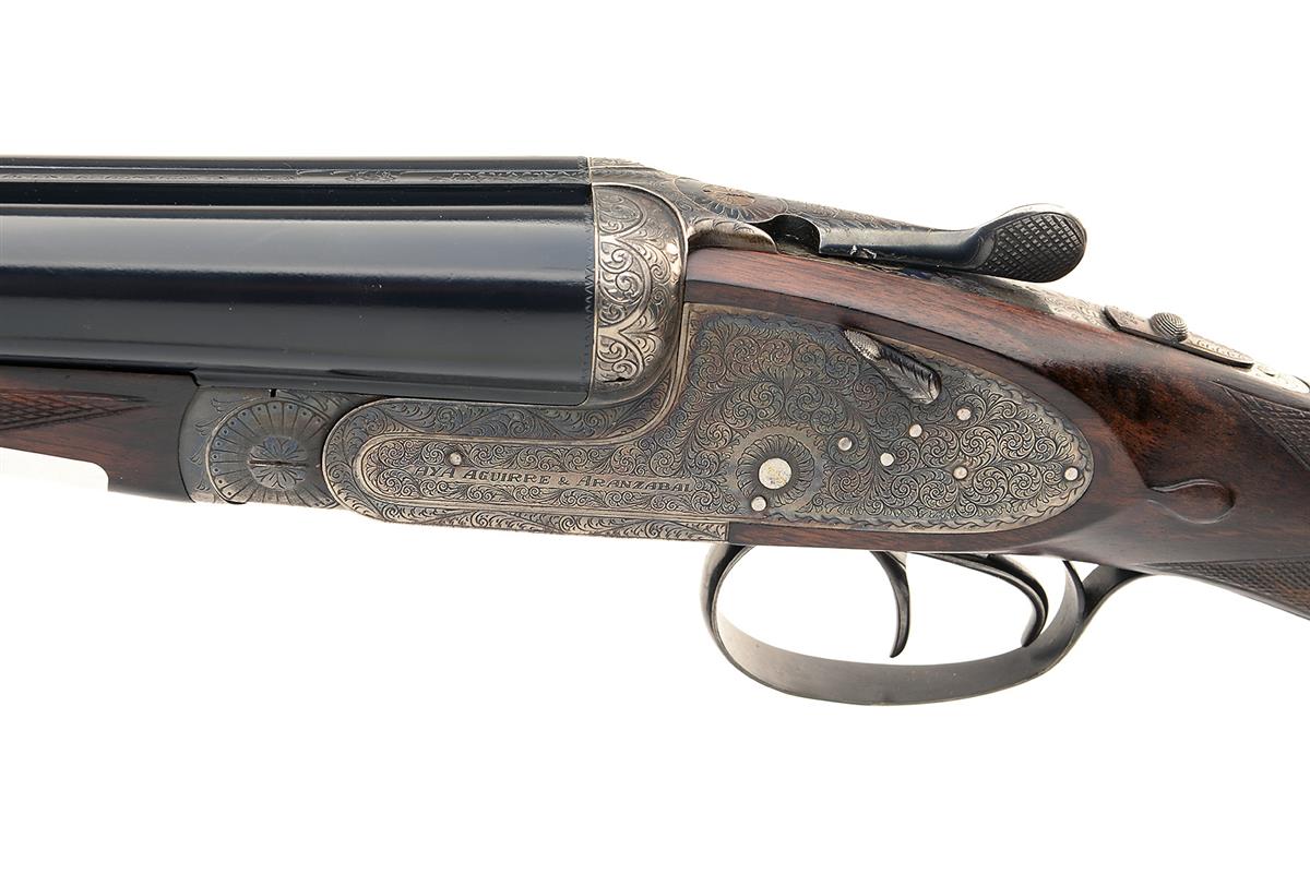 AYA 12-BORE 'MODEL NO.2' HAND-DETACHABLE SIDELOCK EJECTOR, serial no. 557853, 28in. nitro chopperlump barrels (painted black), 2 3/4in. chambers, bored approx. true cyl. in both, removable striker discs, automatic safety with gold-inlaid 'S' detail, hand detachable lockplates, gold-inlaid cocking indicators, articulated front trigger, rolled-edge triggerguard, border and acanthus scroll engraving, retaining some original colour-hardening and finish, 14 1/4in. stock, weight 6lb. 11oz.