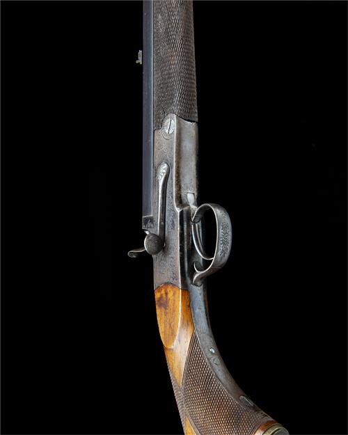 serial number on barrel only, 24 1/8in. black powder proof octagonal barrel, matt top flat with banner engraved in script 'J. BLANCH & SON. 29 GRACECHURCH ST. LONDON', open sights and two folding leaf sights with white metal sight lines and marked '25', '50' and '100', bead fore-sight, horizontal sidelever, fine acanthus scroll engraving, retaining traces of finish, 14 7/8in. figured pistolgrip stock with horn pistolgrip-cap and steel buttplate, later sling swivels attached, weight 5lb. 1oz.